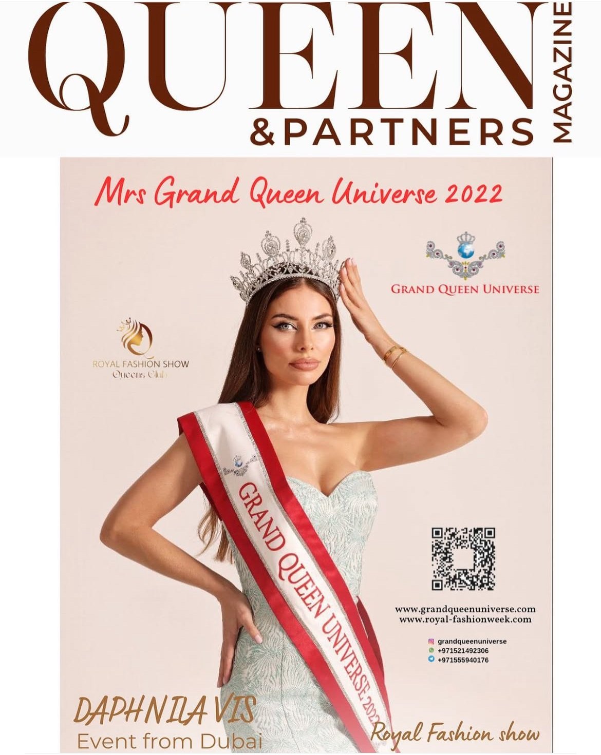 Daphnila Vis graced the cover of Queen & Partners Magazine as the official title winner of Mrs. Grand Queen Universe 2022, representing elegance, strength, and global empowerment from Dubai. She also holds the prestigious title of Miss Grand Queen Netherlands Universe 2022, further cementing her status as a recognized international beauty queen.